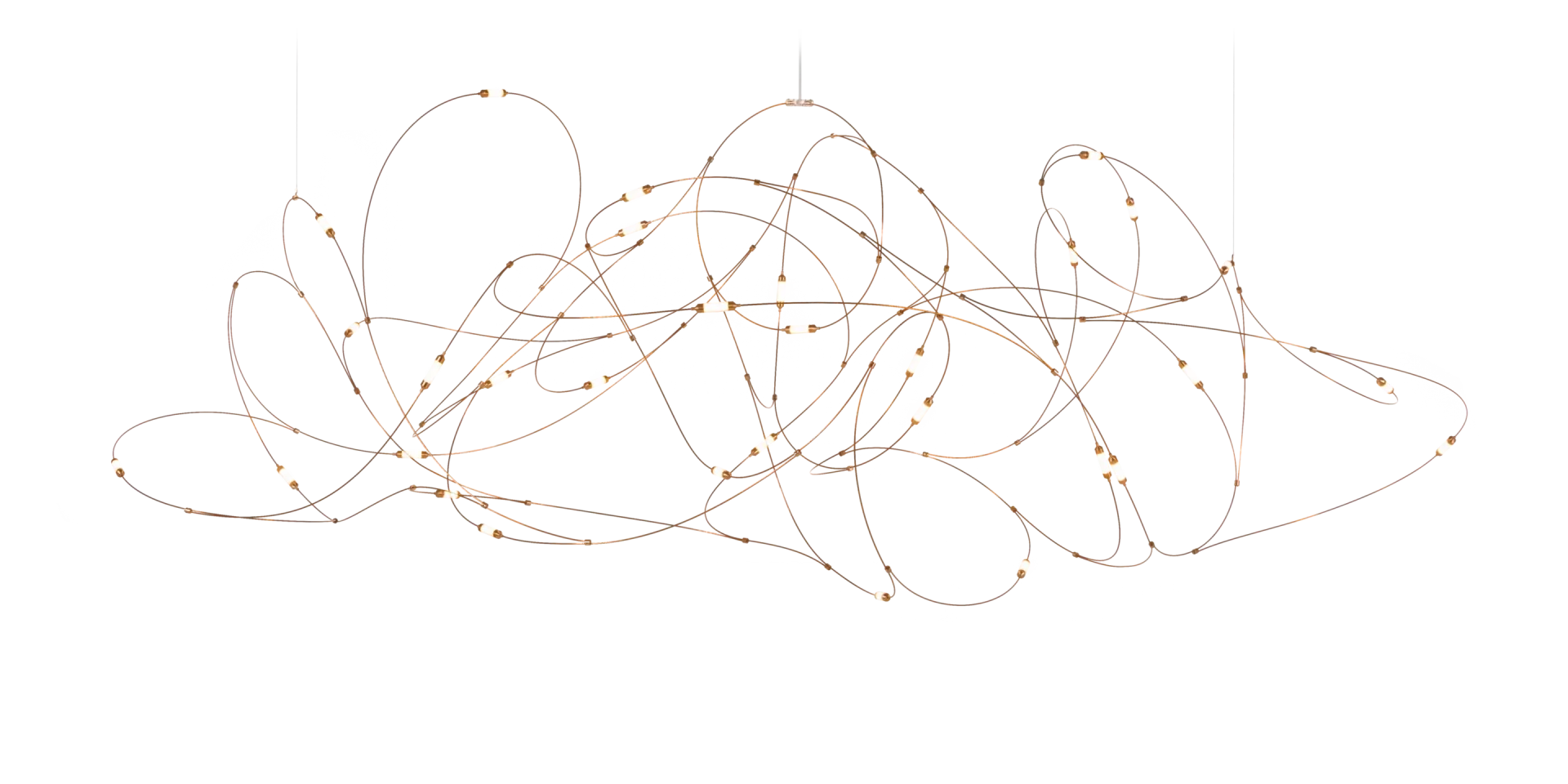 Fijne bronzen draden creëren elegante, gebogen lijnen terwijl de koperen kopjes en LED diffusers fungeren als gloeiende kevers die in de lucht dansen.